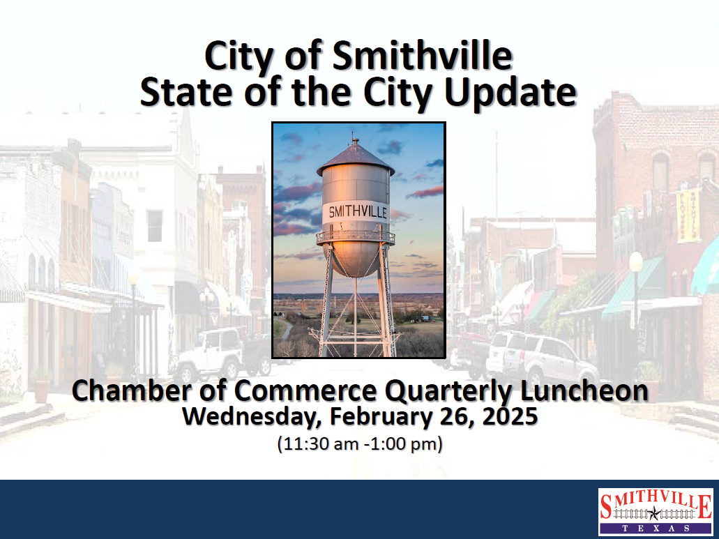 For a copy of the "State of the City" presentation Robert Tamble (City Manager) gave during the Smithville Chamber of Commerce Quarterly Luncheon on 2-26-25. The presentation provided an overview of the City's current financial situation, issues, projects, and future plans. City Manager Robert Tamble's presentation (PDF) at the Smithville Chamber Quarterly Luncheon on February 26, 2025.